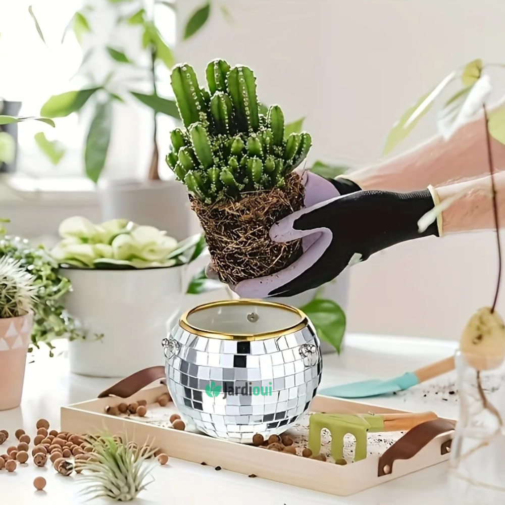 Inspiré des boules disco, ce pot de fleur reflète la lumière pour créer une atmosphère scintillante et joyeuse.
